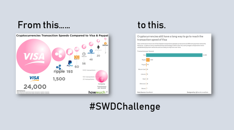 In this view it is much easier to compare the payment methods and determine which handle more transactions per second in comparison to the original chart. The difference between Visa and the second-fastest payment method ‘Ripple’ is much clearer in this view also. In the original chart the difference between Visa and Ripple appeared less since the bubbles were not sized correctly.