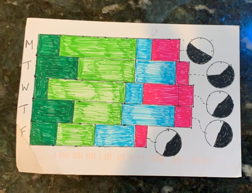 For week 1, we tracked time. We were supposed to track the number of times we looked at the clock during the day. However, I was on annual leave that week, day 1 was New Years’ Eve and my routine was completely out of sync due to the Christmas break. I was actually trying to pay less attention to the time that week so knew I wouldn’t be checking the time half as much as usual.