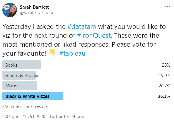After we wrapped up the mobile-first round of #IronQuest, I was all out of ideas on what to viz next. Thankfully, the #datafam weren’t short of suggestions when I asked for ideas on Twitter! With so many ideas flying around, I summerised the four most-popular suggestions I received and put them to a Twitter vote:
