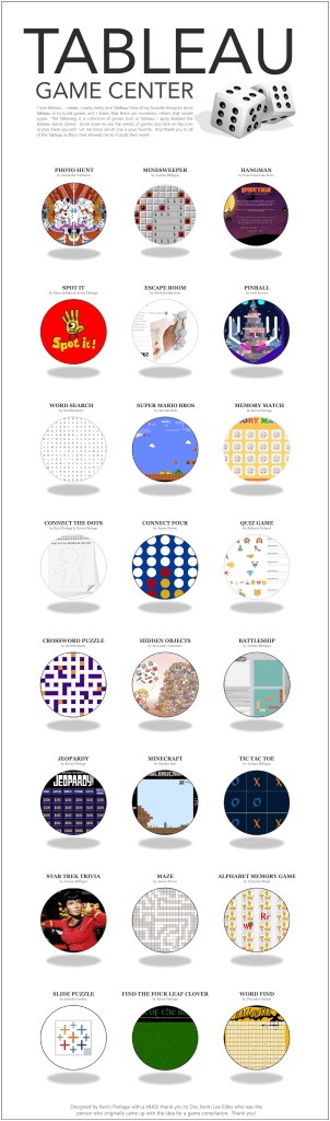 If you want to build a (playable) game in Tableau, look no further than Kevin Flerlage’s “The Tableau Game Center” viz!