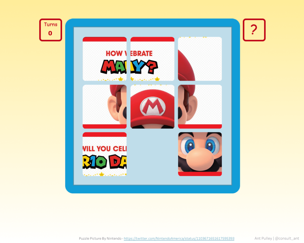 To celebrate Mario Day on March 10th (MAR10), Ant created a classic sliding puzzle game featuring a scrambled picture of Mario himself. In a physical form, a sliding puzzle game challenges a player to slide (frequently flat) pieces along certain routes (usually on a board) to establish a complete picture. This version in Tableau works in the same way. The player can only move a single tile at a time, moving them from left to right or up and down. The game tracks the number of turns; the object being to complete the puzzle in as few turns as possible.