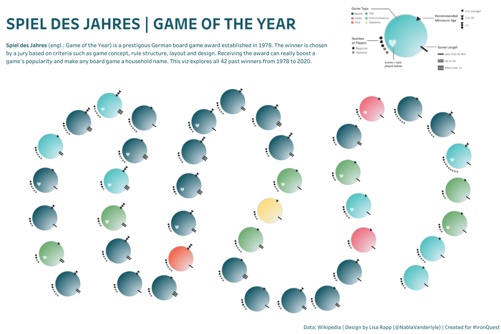 Spiel des Jahres (‘Game of the Year’) is an award for board and card games, created in 1978 with the purpose of rewarding family-friendly game design, and promoting excellent games in the German market. In this viz, Lisa explores all 42 past winners of the award, from 1978 to 2020.