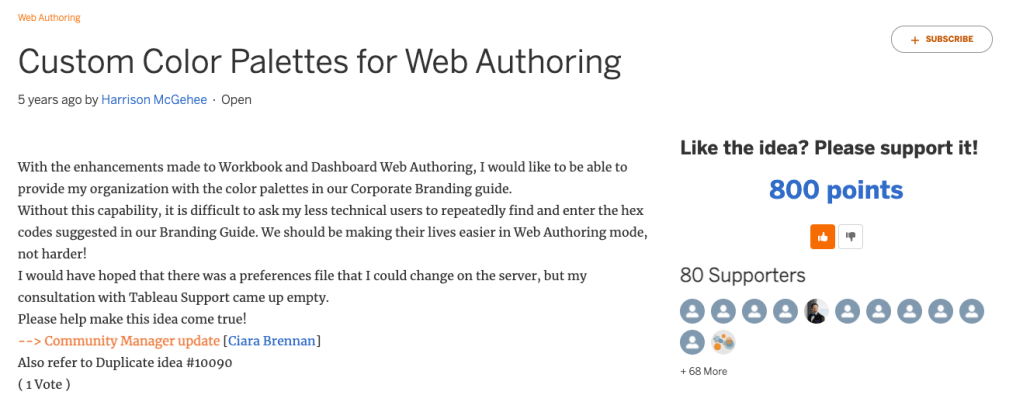 Be sure to add sufficient details to your idea submission so Tableau product managers and developers fully understand your request and can effectively act upon it and community members can sympathise and upvote your idea. You may find it useful to refer to these guidelines shared by Tableau to help you craft an effective idea.