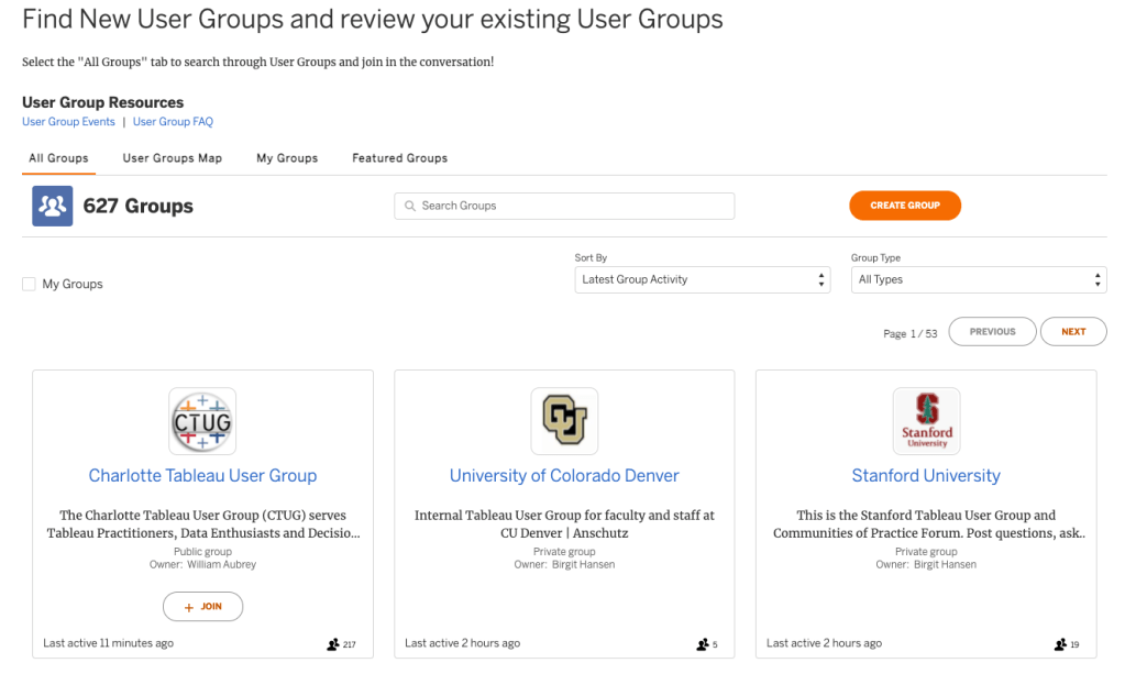 While the main Tableau User Group (TUG) page helps you to find TUG’s and sign up for events, the Community Forums Groups page can be used as a way of engaging with other members from your TUG.