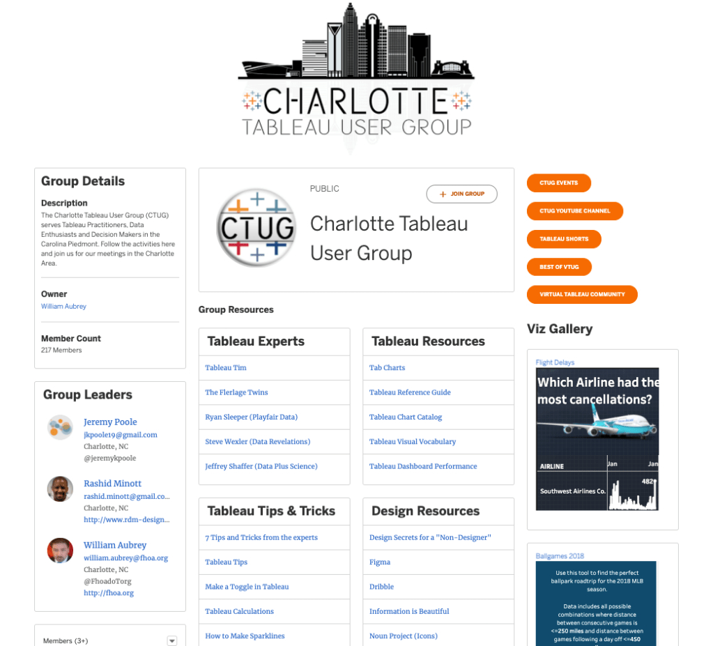 From the Charlotte TUG page, you can find out details about the TUG (including contact details for the leadership team), view details of their next event, watch previous TUG recordings on YouTube, view a viz gallery of Tableau Public vizzes created by Charlotte TUG members, as well as find links to a wide range of helpful Tableau content.