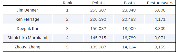The Forum Leaderboard is refreshed daily and shows Forum members ranked by the number of points they have earned since they started engaging on the Forums. The members at the top of the table such as Community Rockstars Jim Dehner, Ken Flerlage and Deepak Rai have a staggering number of points, a testament to their dedication to the community and helping others: