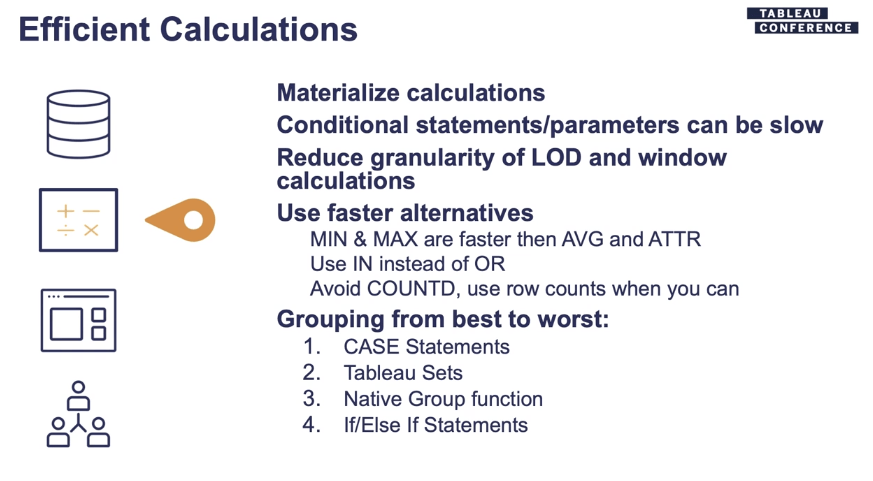 Nobody enjoys working with slow, inefficient workbooks but sometimes it can be difficult to pinpoint exactly what steps to take to improve performance. In this session, Ben shares how to plan, create, and deploy dashboards with efficiency and performance in mind. You won’t want to miss the advice shared in this session, such as the efficient calculation tips shared in the screenshot below!