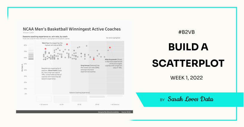 For Back to Viz Basics (#B2VB) week 1, the challenge was to build a scatter plot. The selected data set focused on NCAA Men’s Basketball coaching records, namely the winningest active coaches (those with a win rate of 50% or higher). For each coach, it included their win rate and the number of seasons’ coaching experience they held. In the challenge description, Eric specifically mentioned he would like to understand if there is a relationship between seasons coaching and overall win percentage.