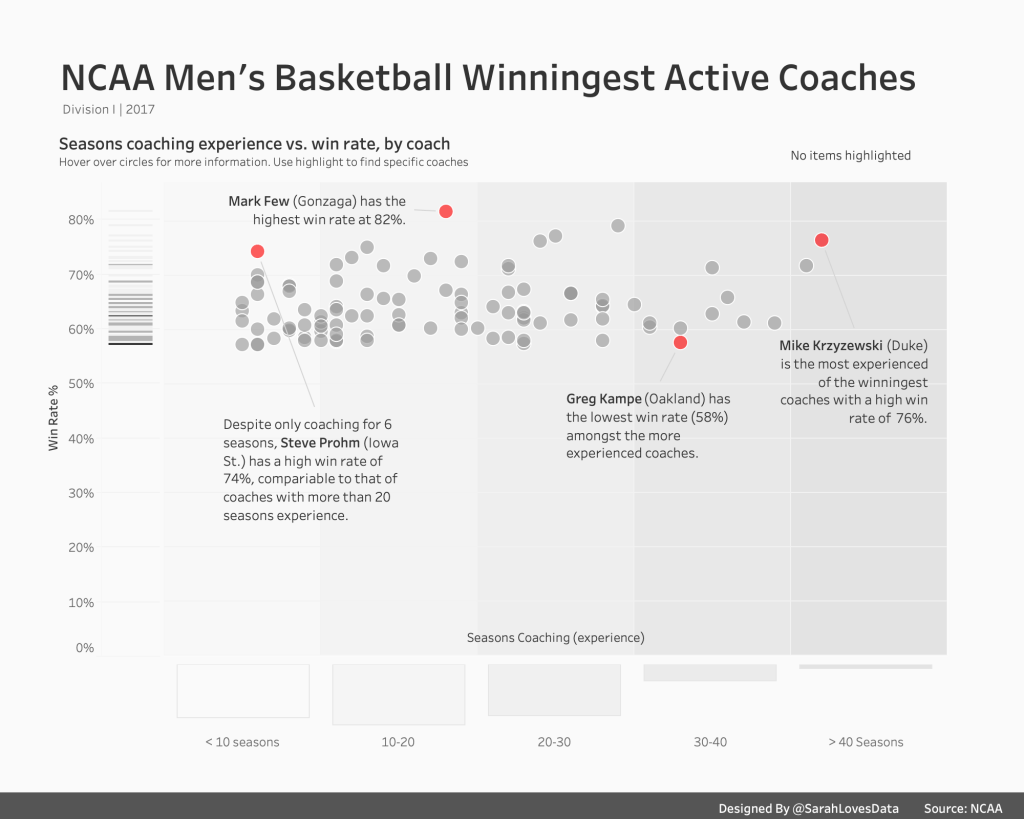 As I mentioned at the beginning of this post, I know very little about college basketball and nothing about college basketball coaches! However, I noticed that some coaches appeared to be outliers in this dataset. Some had high win rates compared to other coaches with the same experience, while others had more experience than most. I decided to focus attention on these coaches by shading them in red (the only colour used in this viz, aside from grey) and adding annotations to explain why they stand out. My annotations are simply based on observations I made from the data. In the annotation text, I opted to include the coaches’ team as I thought this could be insightful for anyone more knowledgable in college basketball.