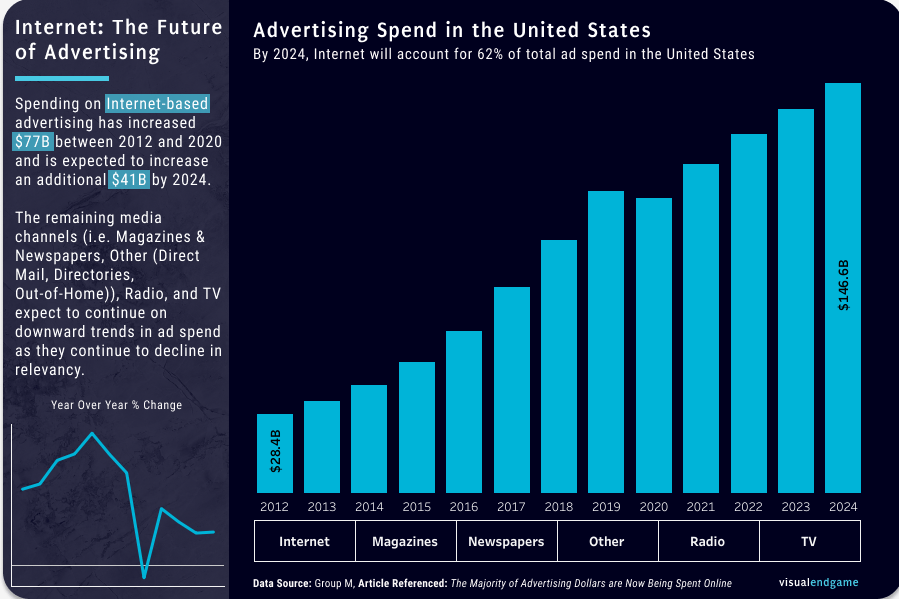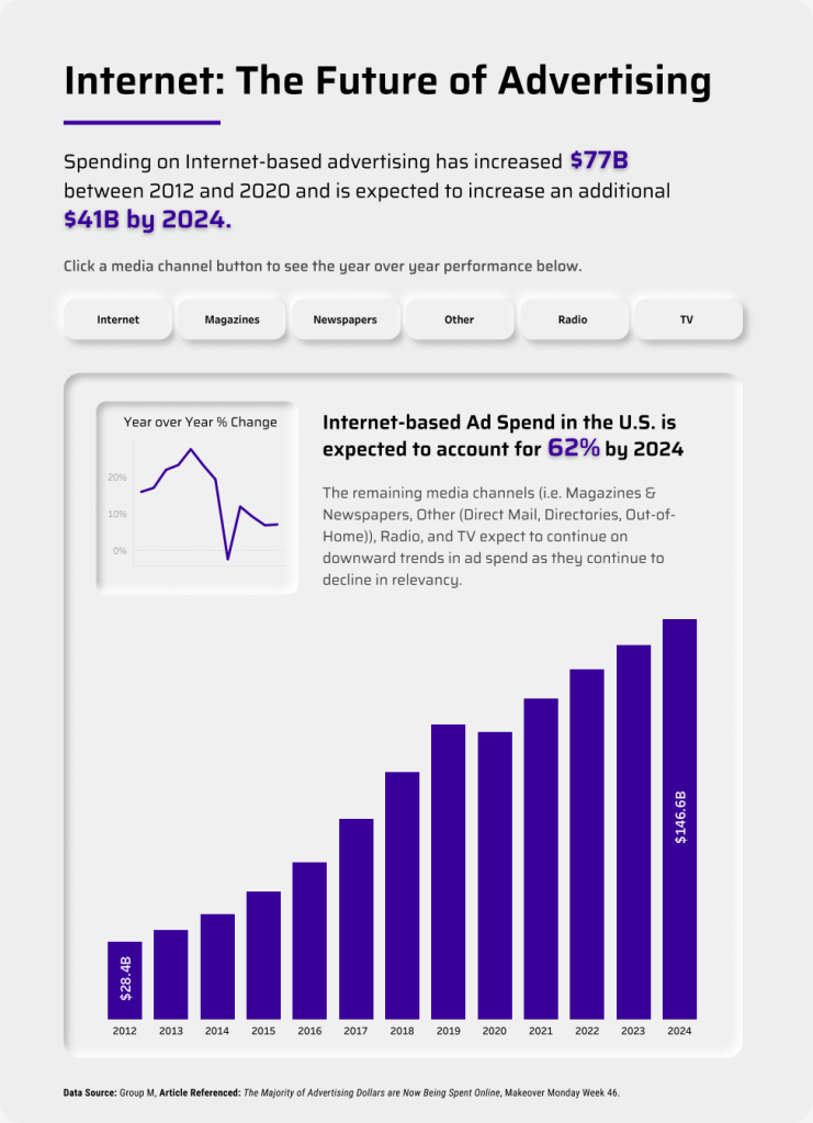 Next, we have an example by Tina Covelli. In November 2020, Tina participated in #MakeoverMonday and published a viz looking at advertising spending in the United States. She revised the viz a year later and visualised it again in a completely different style.