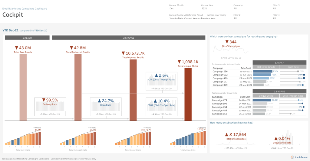 A few people in the Tableau community have also attempted to recreate vizzes from the Tableau Accelerators gallery. For example, Autumn Battani recently recreated this Email Marketing Campaigns Cockpit Dashboard: