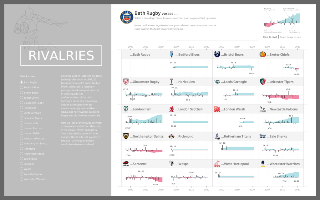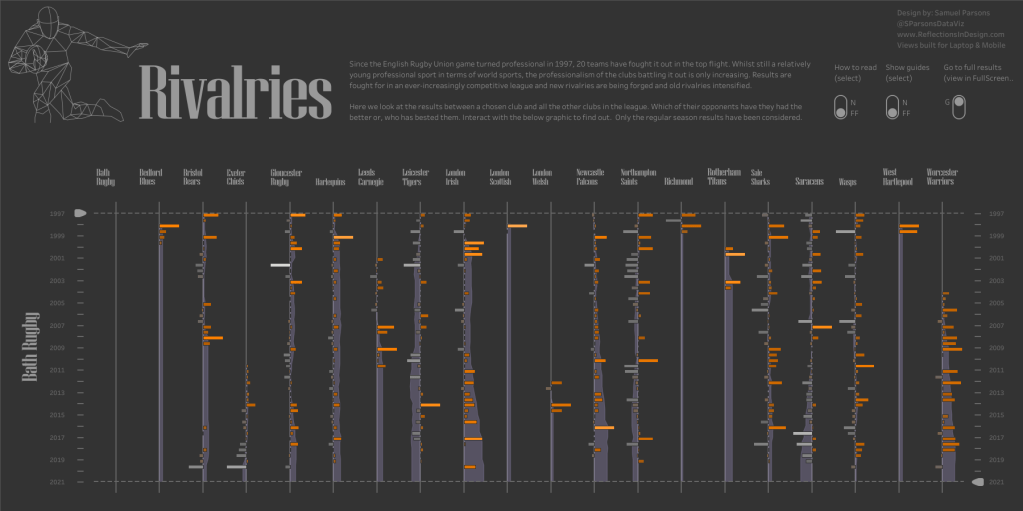 Next up are two vizzes by Samuel Parsons. In March 2020, Samuel visualised rivalries in Rugby Union. In October 2021, he revamped the viz with a brand-new version. It’s interesting to see how Samuel’s design and approach is completely different in the revamped version.