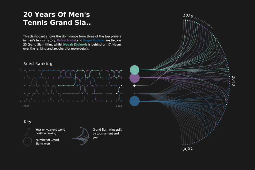First up is this viz by CJ Mayes which visualises 20 Years of Grand Slam Championships. CJ originally published this viz in November 2020, then re-created it in February 2021. While the original version is stunning, the revamped version is a testament to how CJ was able to grow his Tableau and design skills over the course of a few months!
