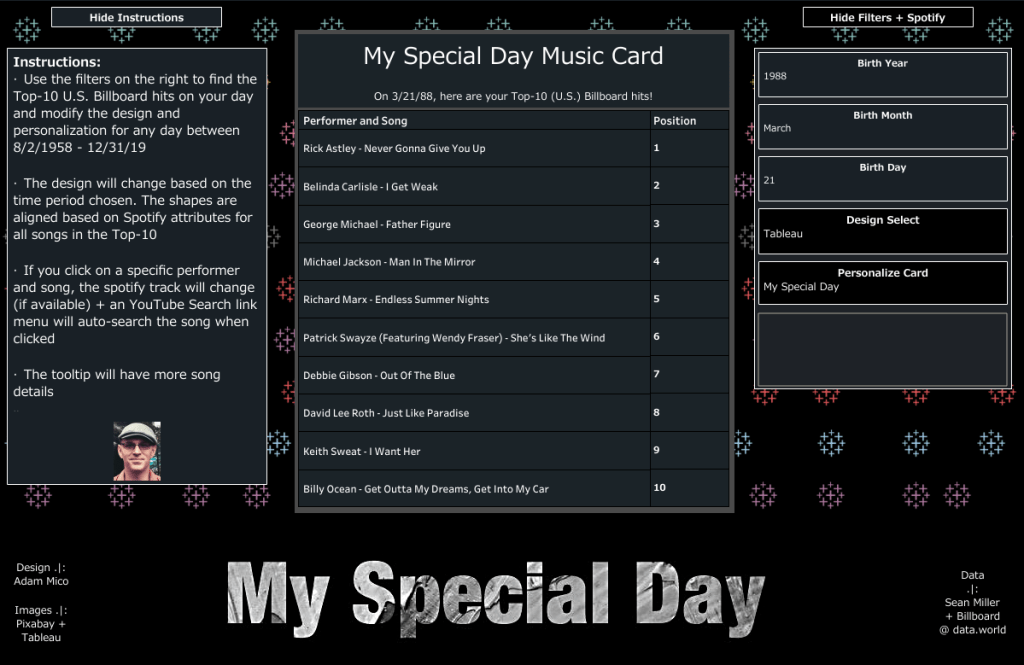 Next up are two vizzes by Adam Mico. In the first viz, Adam uses a Top 10 U.S. Billboard hits dataset to enable the user to find the songs that were top 10 on a chosen date. Interact with the viz to find out what songs were top of the charts when you were born!