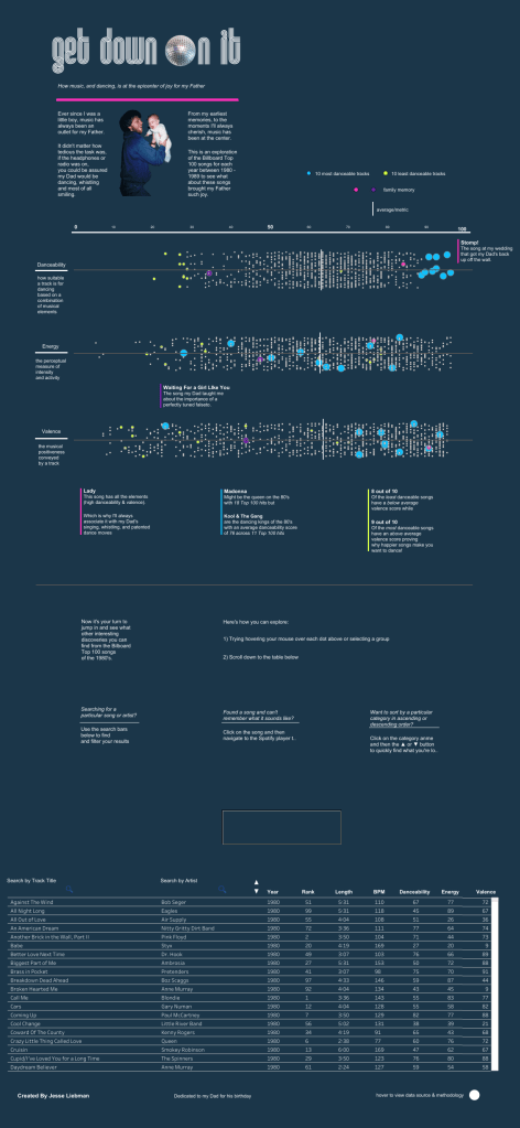 Second, we have a viz by Jesse Liebman which focuses on the 80’s hits that his Father used to enjoy dancing to.