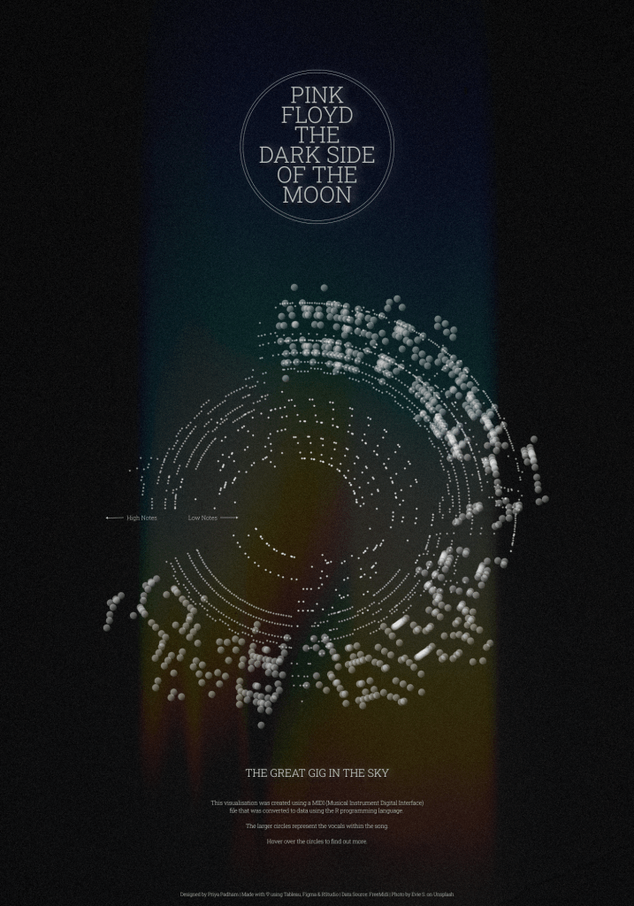 Last month, the #DataPlusMusic project ran a challenge that encouraged participants to visualise MIDI (Musical Instrument Digital Interface) files. Unlike regular audio files like MP3s or WAVs, these don’t contain actual audio data and are therefore much smaller in size. They instead explain what notes are played, when they’re played, and how long or loud each note should be. Using a few lines of code in R, participants were able to create beautiful visualisations using MIDI files from some of their favourite songs. Below is an example of Pink Floyd’s ‘Dark Side of the Moon’, visualised by Priya Padham.