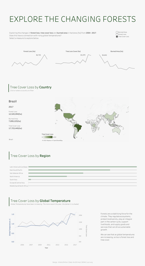 For this viz, Alisha redesigned a viz she first published in 2020 on forest loss, tree cover loss and burned areas. With the new version, she took a minimal approach, increasing the use of white space and simplifying her use of colour. She also changed the orientation of her viz to long-form to help guide her audience through the story. The result is an effective, easy-to-consume viz.