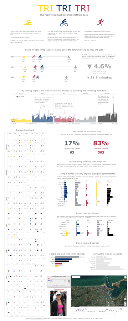In this quantified-self viz, Michelle reimagined her 2019 viz in which she tracked her 2018 Nantucket sprint triathlon training data. With the new design, Michelle took a more detailed approach, reducing the size of the training days table to create more space for a monthly and weekly summary of her training schedule. I like how Michelle used icons and colours consistently throughout this viz, while her use of annotation and text helps to explain the data, and story, to her audience.
