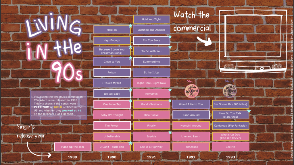 For this viz, Jessica took us right back to the 90s with her on-theme, fun design! This viz explores the tracks included on the ‘Living in the 90’s’ two-CD compilation, released in 1995. Jessica even included a TV on her viz for the audience to watch both the commercial for the CD, as well as the music videos for each of the tracks so you can immerse yourself in the very best of the 90s without even leaving Tableau!