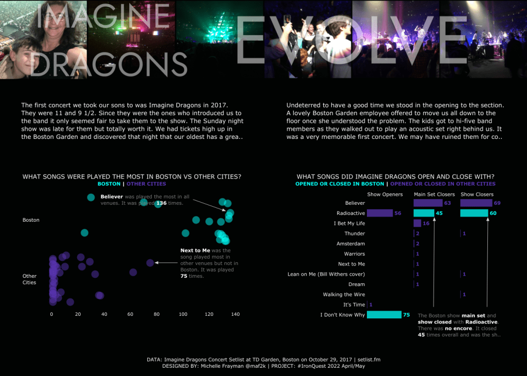 For this viz, Michelle visualized the Imagine Dragons 2017 ‘Evolve’ tour. Michelle attended the Boston night of the tour with her family and for this viz, compared the set list from the Boston show with other nights on the tour. She also explored the most-frequent show openers, main set closers and show closers. I love how Michelle included a quantified-self element to this viz and approached the data from a personal perspective to help tell a compelling story.