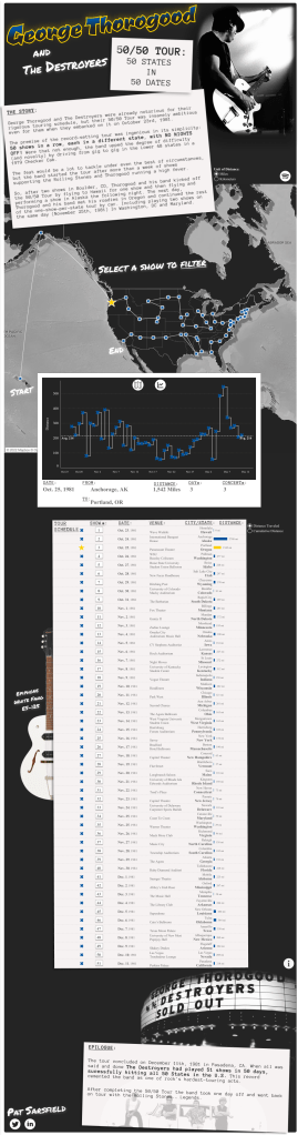 For this viz, Patrick visualised the epic 50/50 tour by George Thorogood and The Destroyers in 1981. The tour featured 50 shows in a row, each in a different US-states, with no nights off in between! The band even drove from gig to gig in the Lower 48 states in a 1979 Checker Cab!