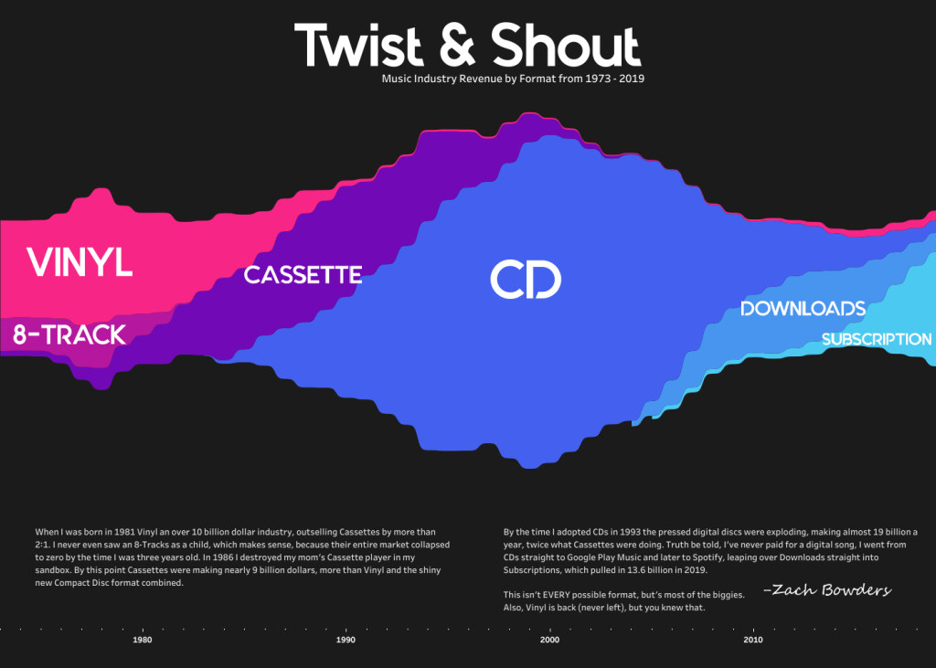 In this viz, Zach explores the evolution of the different music industry revenue formats, starting in 1973 when vinyl was the dominant music format and ending in 2019 when downloads and subscriptions were the most popular ways to consume music.