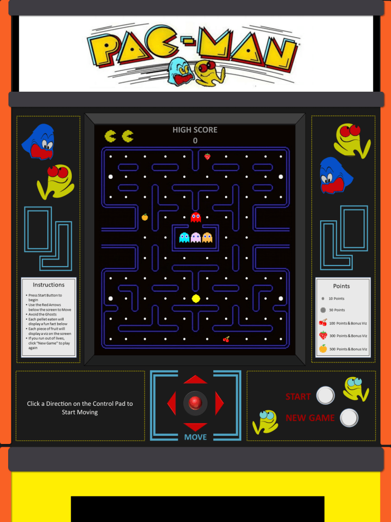 For this viz, Brian built a working Pac-Man game in Tableau!! That, in itself, is impressive but Brian didn’t stop there. When eaten, the edible pellets each display a fun fact about the game at the bottom of the viz, while the pieces of fruit (when eaten) will trigger a separate viz about Pac-Man facts to be shown on the screen. This is a fun way of incorporating data about the game into the game itself.