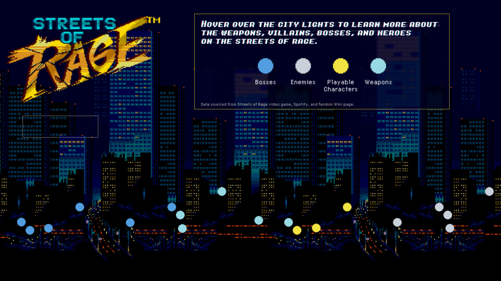 In this viz, Tina re-imagined the game, ‘Streets of Rage’, first released in 1991, in Tableau. Tina used the game background to reveal details about the game, including bosses, enemies, playable characters and weapons. Hovering over the city lights reveals a clever tooltip with additional details and imagery on each item. The viz even comes complete with music from the game for full effect!