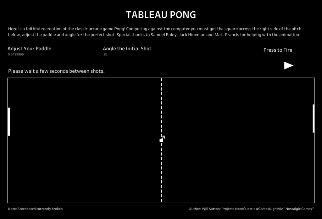 In this viz, Will re-imaged the classic arcade game, Pong, in Tableau! Pong was one of the first computer games ever created. This simple ‘tennis-like’ game features two paddles on either side of the screen and a ball (square) in the middle. In this version, users can adjust the placement of the paddle and angle of the initial shot. I love the animation Will used in this viz. Check it out for yourself in Tableau Public!