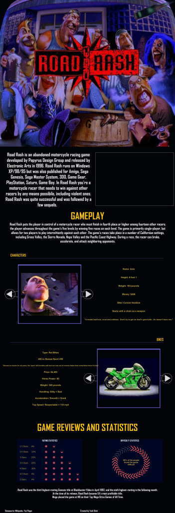 In this viz, Yash explored the motorcycle racing game, Road Rash, released in 1996. In the game, players can select different characters and bike models, all of which are included in Yash’s viz. Yash also included some data on game reviews and stats that show the popularity of the game at its peak in the 1990s. I love how the difficulty rating chart looks like a bike wheel!