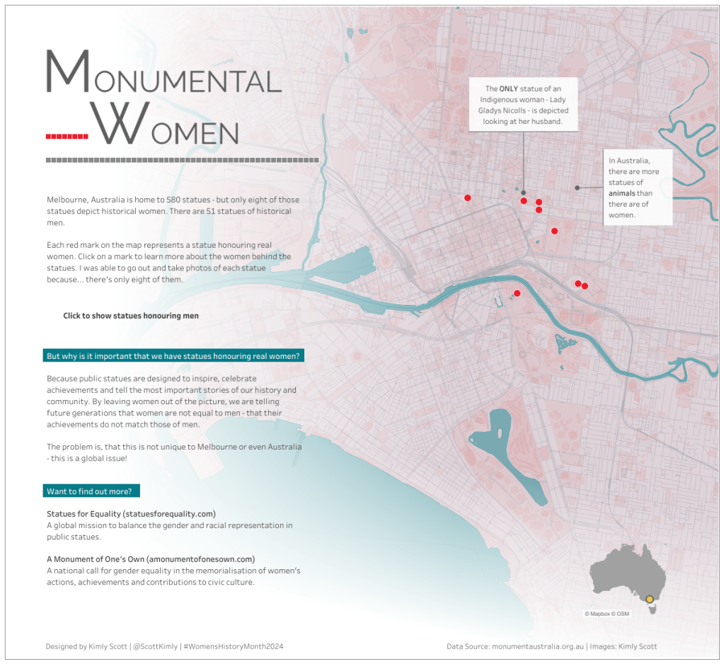In this viz, Kimly looks at data on the number of statues in Melbourne, Australia, where they are located, and how many honour women.