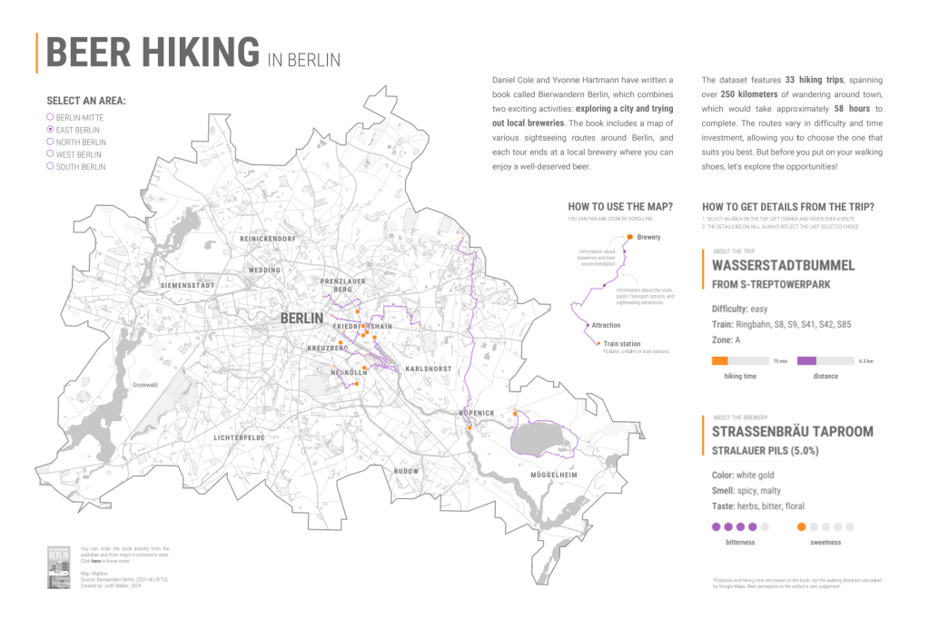 In this viz, Judit vizzes 33 hiking routes in Berlin, with each route featuring breweries you can visit along the way!