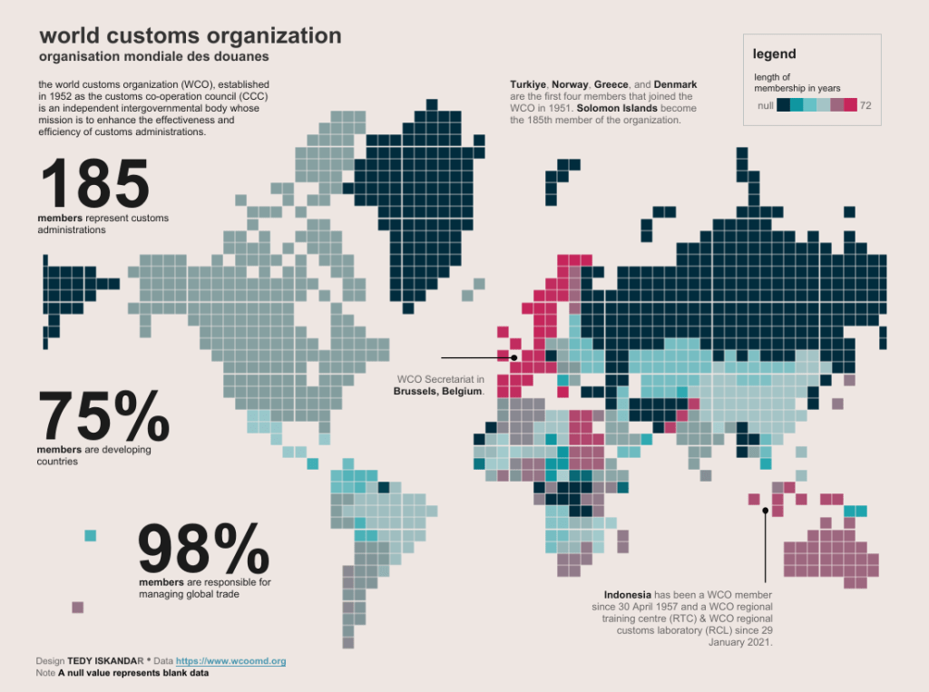 In this viz, Tedy uses a square tile map to visualise membership of the World Customs Organisation, by country and length of membership.
