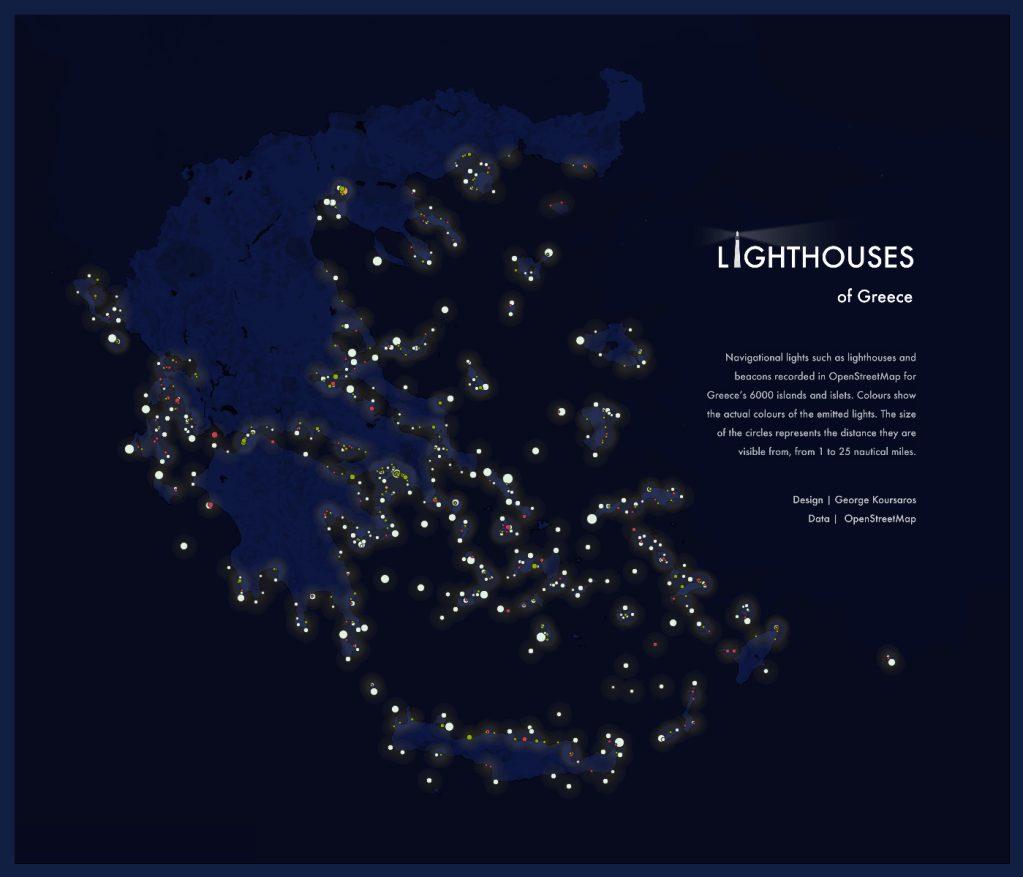 In this viz, George maps the location of 6,000 lighthouses across the Greek Islands.